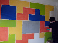 | Artisten i arbeid, maskeringstape på og første strøk farger, tre strøk magnetmaling |